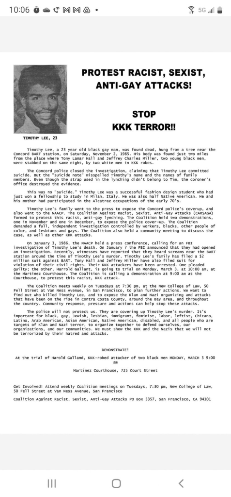 The suspects in the Nov. 2 stabbings that preceded Lee’s death contend that their white robes, with accurate Klan markings, were merely costumes worn to a Halloween party. The existence of such a party has not been established.