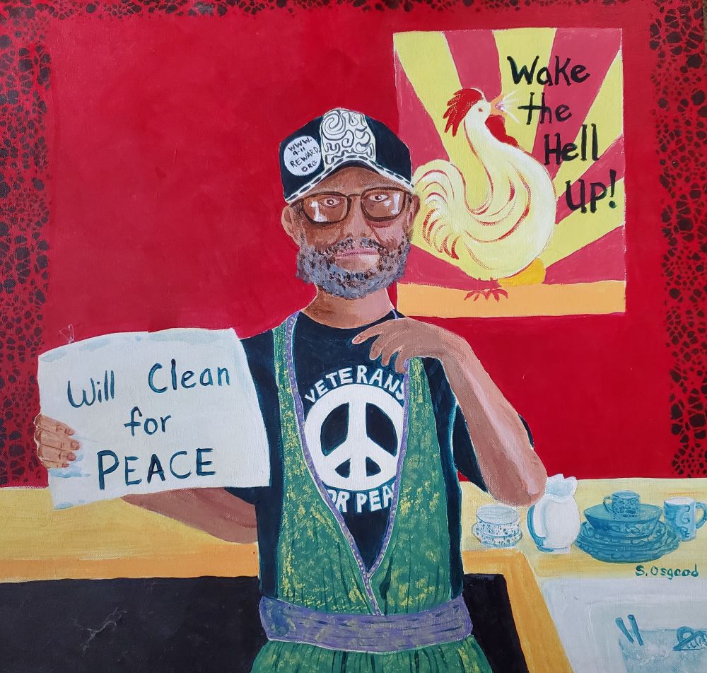 Art work by Social Justice and Peace Activist Shirley Osgood. She saw me washing dishes wearing an apron during a breakfast gathering following one of our montly vigils at Beale Air Force Base against Drone Warfare!