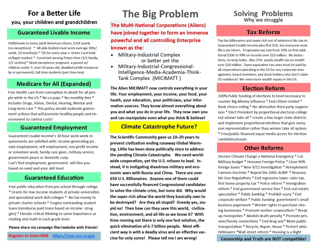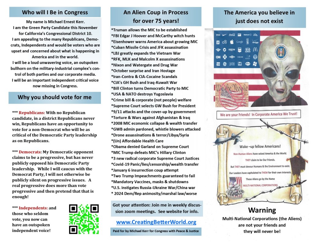 As you can see, my brochure theme is: multi-national corporations are not human but more like ALIENS who do not care about humans! Most of our politicians have capitulated to these ALIENS who are destructively feeding on us humans and the environment.