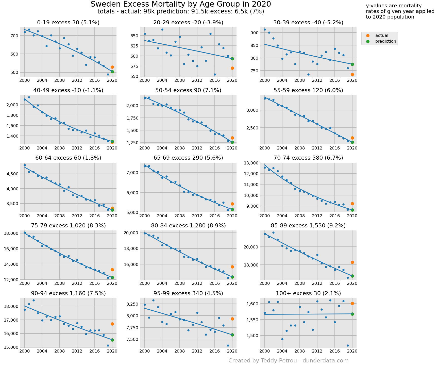 Finally, the following chart shows Swedish mortality from 2000 to 2020 by age group. As can be seen, there is significant excess mortality in people over 65, and possibly in people between 50 and 59.