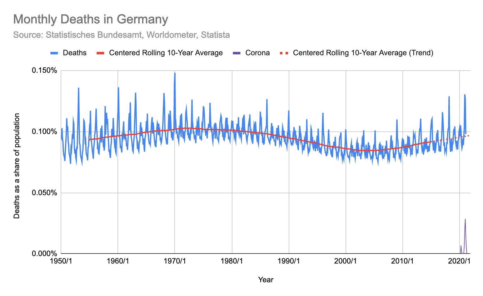 The following chart shows yearly German mortality from 1990 to 2020. Germany had an excess mortality of only about 5% in 2020; however, the German covid infection rate was only about 10% by the end of 2020, due to a very mild first wave in the spring of 2020.