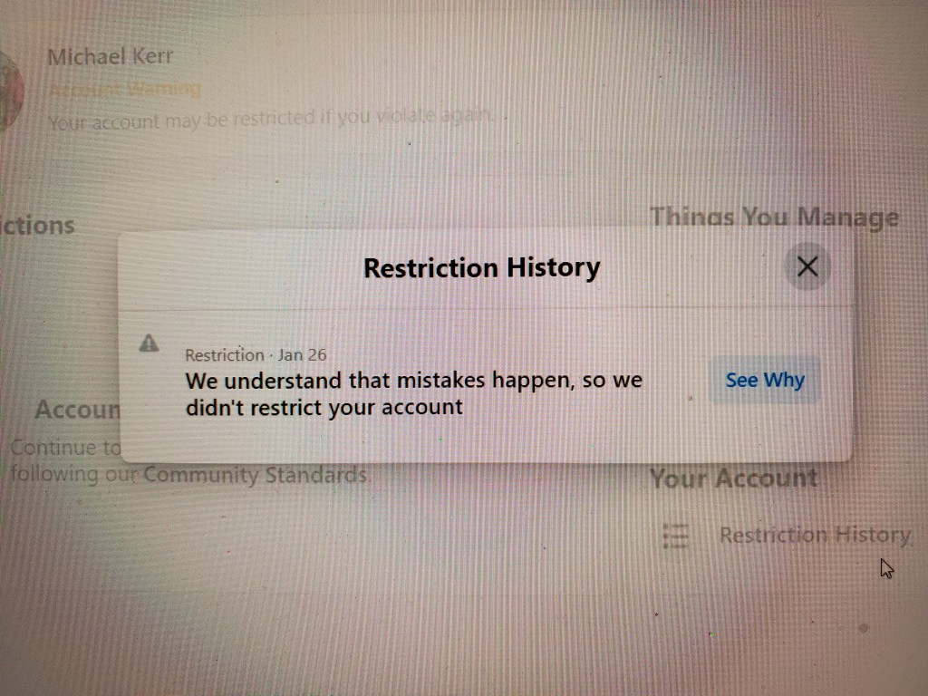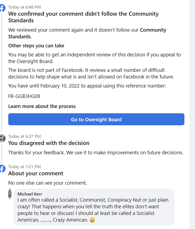 Note: FB provides no clear reasons for their censorship and their review of censorship complaints is an almost long meaningless process that is treated like a lottery where they state it is unlikely a human will ever look at your complaint challenge. The censorship Is based on algorithms and words, not how the words are used in a thought concept. Subjective concepts a child might understand are still way beyond the grasp of computer programming! “Infant like” AI mentality is now making serious judgements on human thoughts and ideas! This is all fine with our corporate owned government which is quite happy censoring any criticism or exposure of corruption!