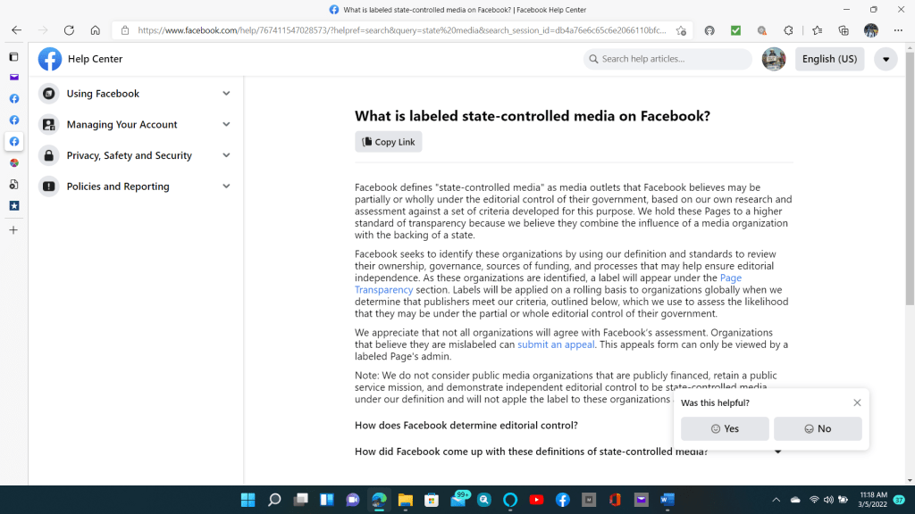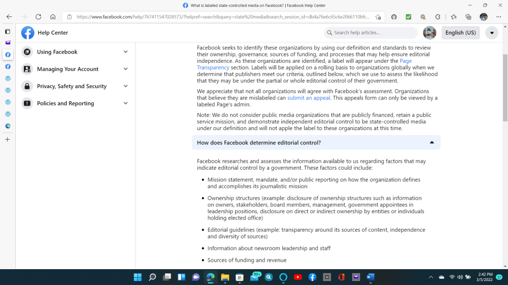 Facebook seeks to identify these organizations by using our definition and standards to review their ownership, governance, sources of funding, and processes that may help ensure editorial independence. As these organizations are identified, a label will appear under the Page Transparency section. Labels will be applied on a rolling basis to organizations globally when we determine that publishers meet our criteria, outlined below, which we use to assess the likelihood that they may be under the partial or whole editorial control of their government.