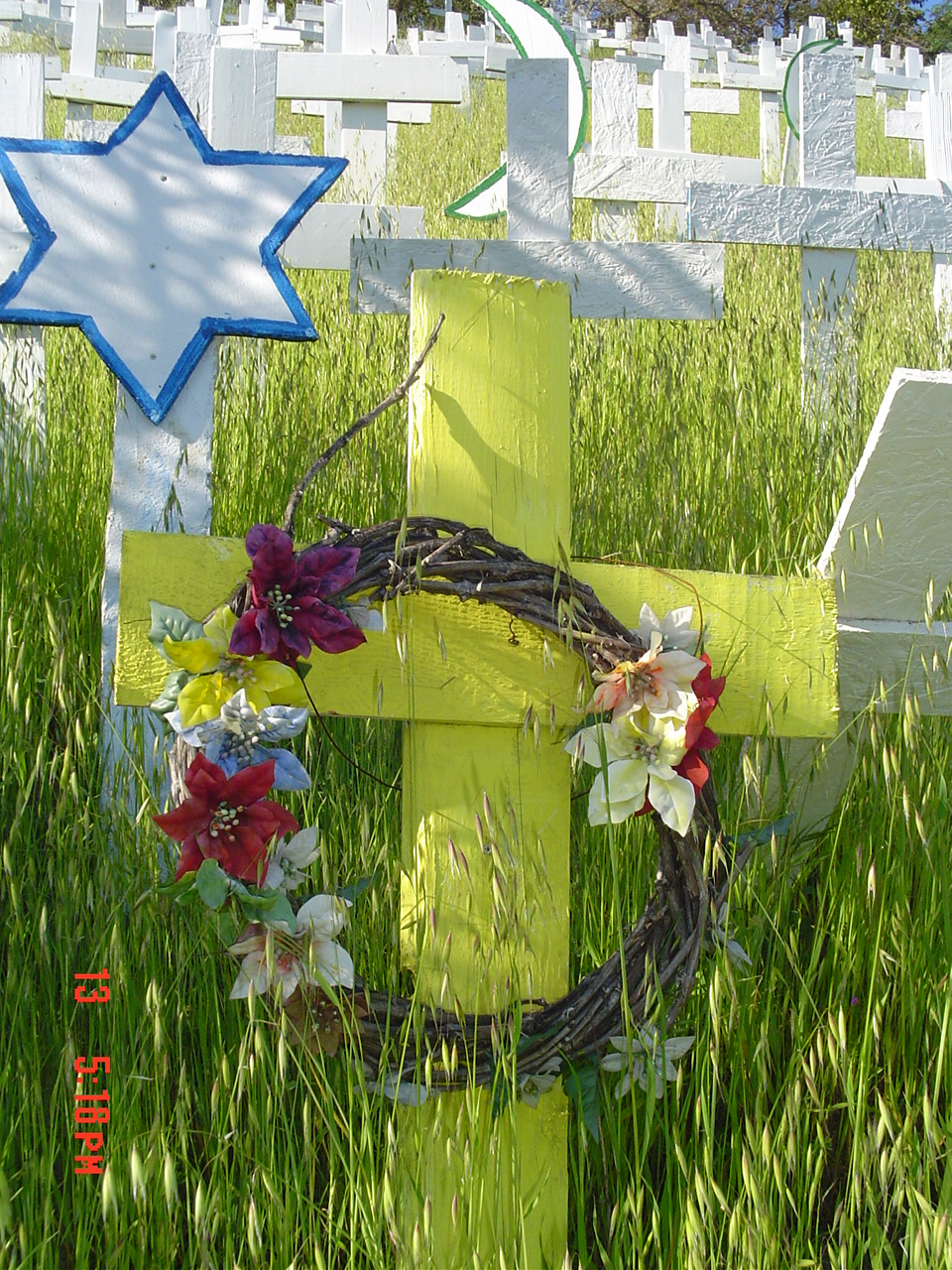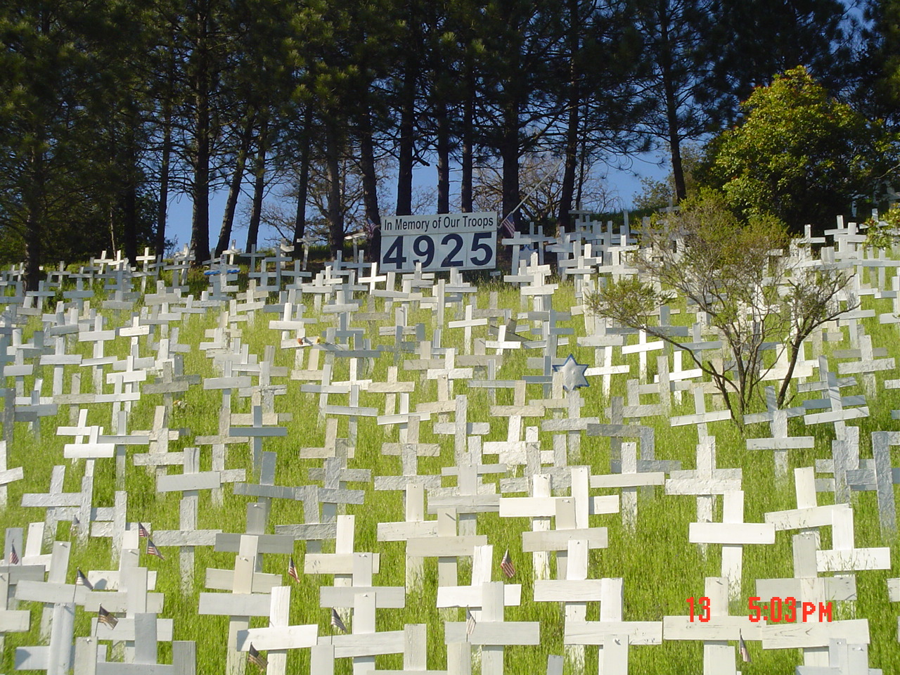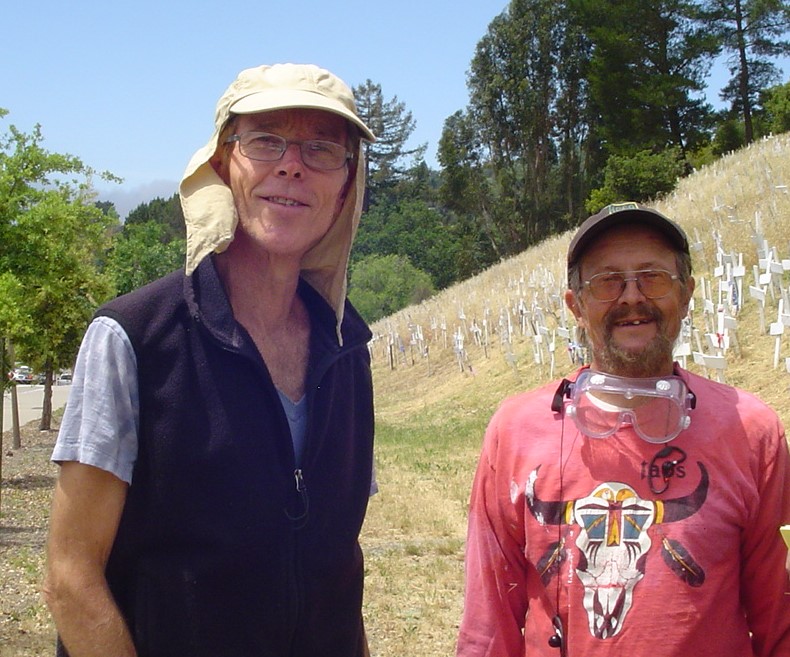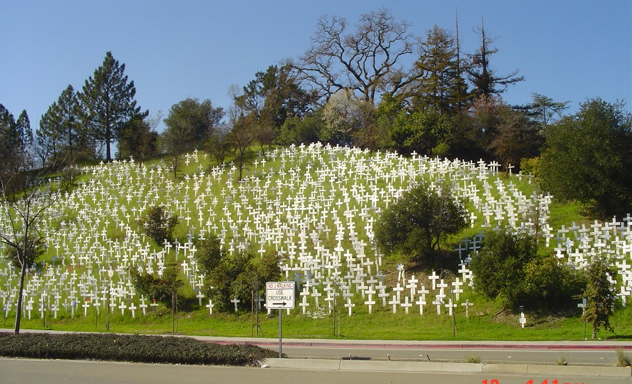 Crosses of Lafayette Memorial is a hillside memorial across from the Lafayette Bart Station. Each cross or other symbol represented each American soldiers who were killed in Iraq and Afghanistan. I helped built 75 of the original 300 crosses. However, when the hillside became so full, new crosses stopped at 4000. A large sign continued to track each soldier’s death. For me, the memorial also recognizes and honors all the injured soldiers, and all the innocent civilians in those two countries who have lost their loved ones their homes and way of life. in senseless wars!