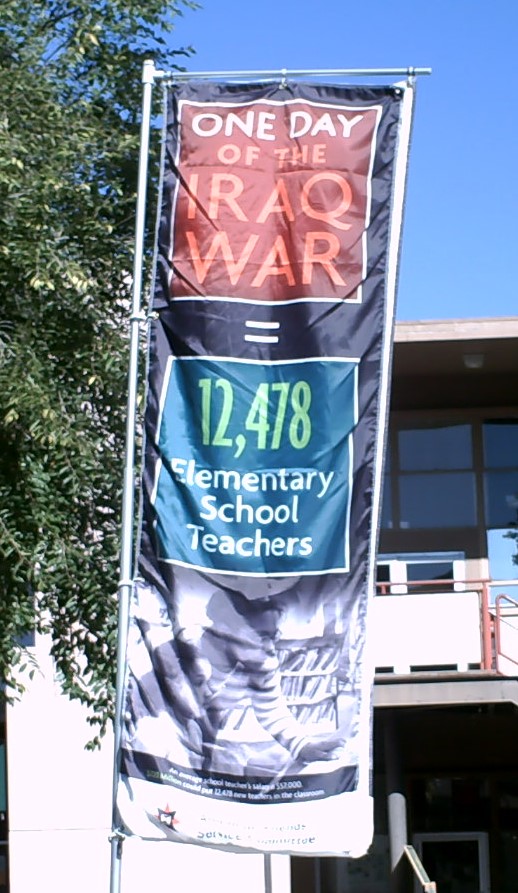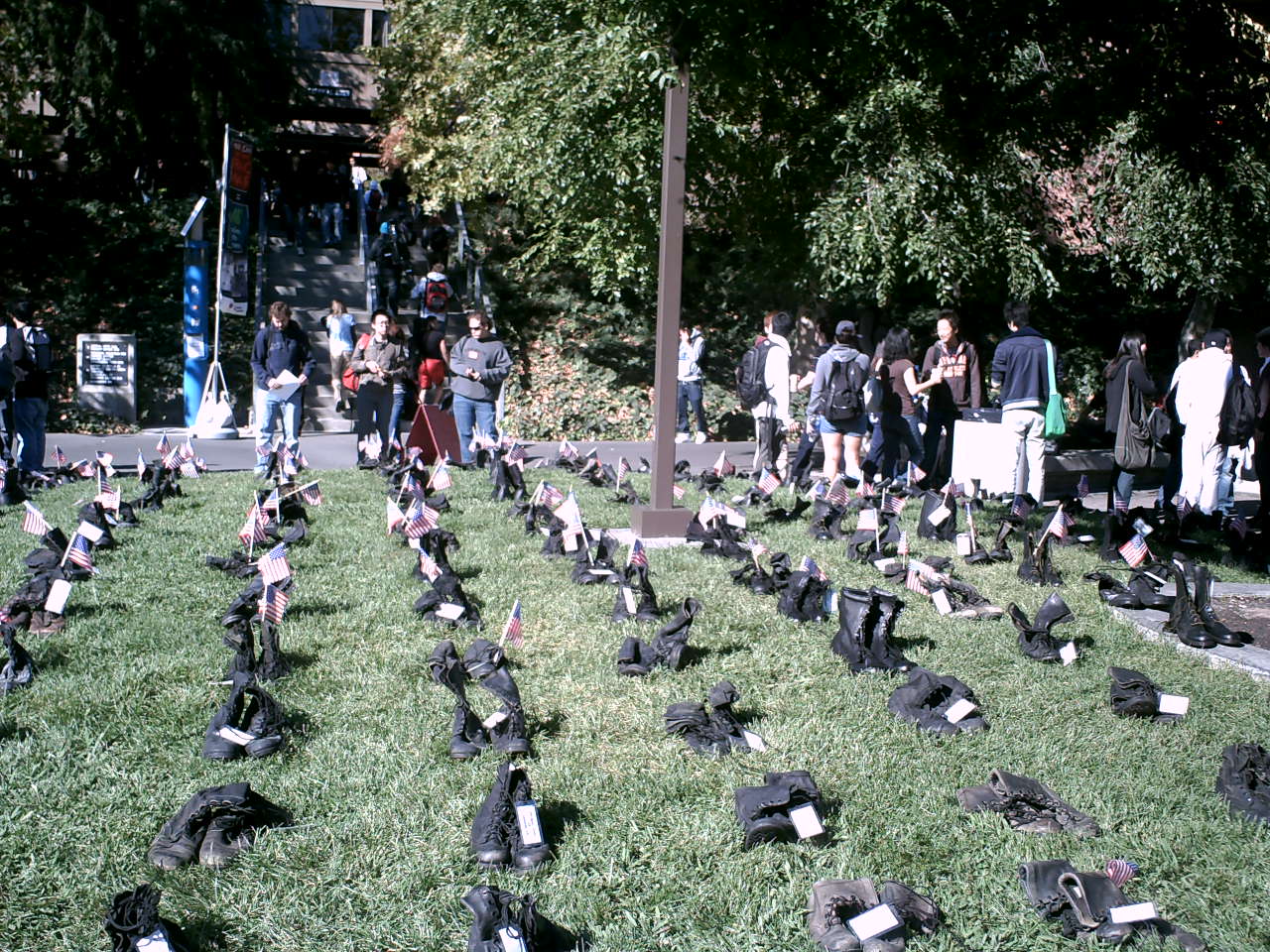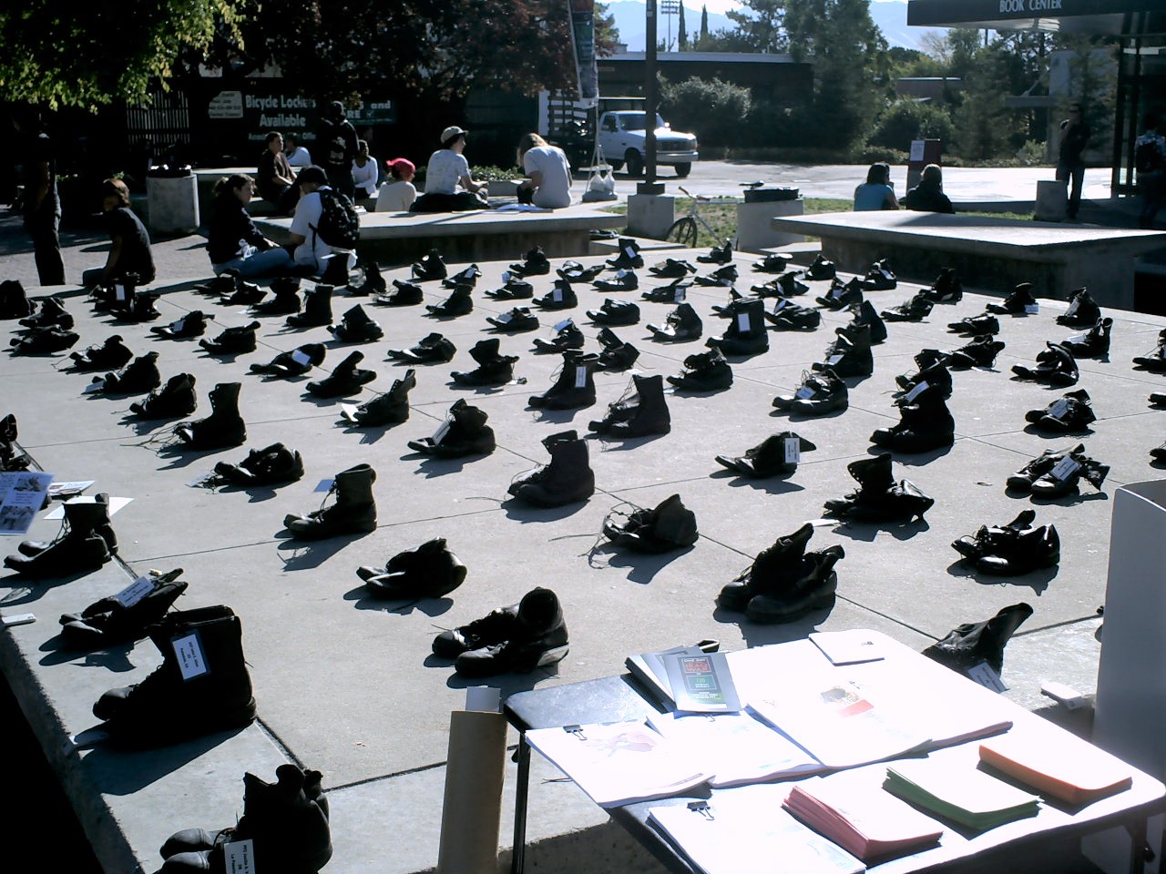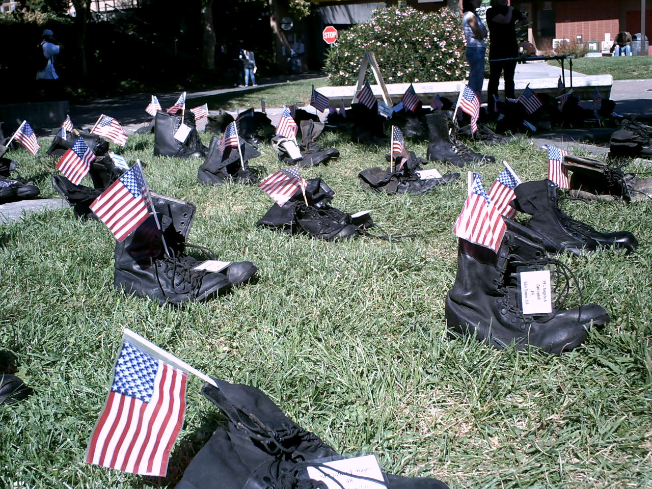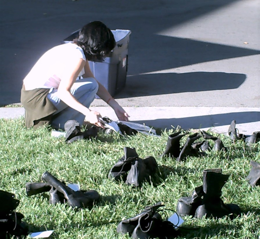 A group of us set up the American Friends Service Committee’s Eyes Wide Open military boot exhibit at Diablo Valley College (DVC). We wanted this visual display to bring home the loss of life in our senseless wars after 9/11.
