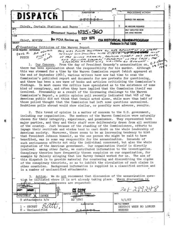 The CIA dispatch only became public in 1976 following a Freedom of Information Act request by the New York Times. On the dispatch were marked “PSYCH” (for psychological warfare) and “destroy when no longer needed.” The subject line read: “Concerning Criticism of the Warren Report.”