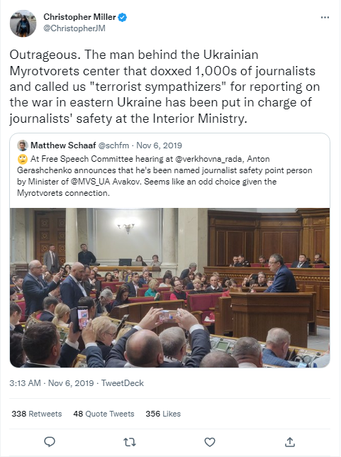 Ukraine’s Advisor to the Minister of Internal Affairs, Anton Gerashchenko is believed to have initiated Mirotvorets. Ironically, in 2019 Gerashchenko announced at a Free Speech Committee hearing, that he was named “journalist safety point person” by the Minister of Internal Affairs.