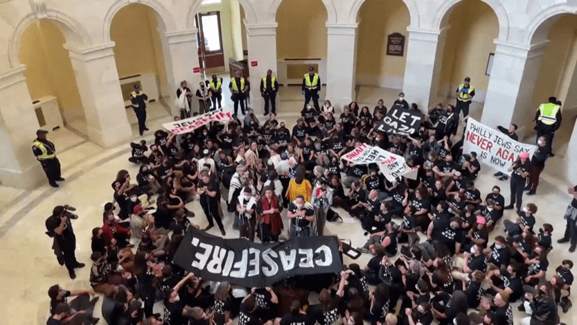2024-03-12 Jewish Progressives Stage Sit-In at Hakeem Jeffries’ Office to Protest AIPAC Influence Sharpening their focus on the influence that pro-Israel lobbyists have had for decades on U.S. policy regarding Palestinians, Jewish progressives on Tuesday held a sit-in at the Capitol Hill office of U.S. House Minority Leader Hakeem Jeffries, one of the largest recipients of campaign funds from the American Israel Public Affairs Committee.