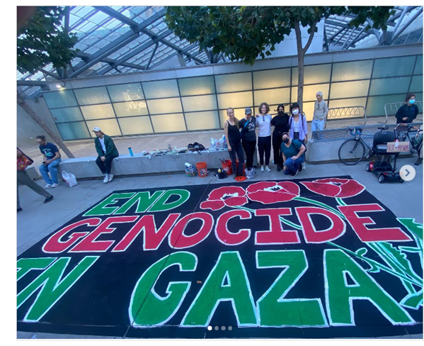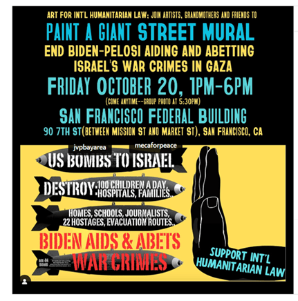 2023-10-20 ART FOR INT’L HUMANITARIAN LAW in SF join artists, grandmothers and friends to paint a giant STREET MURAL calling for: END BIDEN-PELOSI AIDING AND ABETTING ISRAEL’S WAR CRIMES IN GAZA