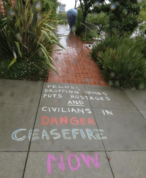 By that time I joined Susan, able to see Pelosi through the dark glassed window. I politely and urgently asked the Congresswoman to please accept our letter. We were ignored and Pelosi’s vehicle drove off. Susan and I both agreed afterwards that the continued bombing of GAZA puts both civilians and Israeli hostages in grave danger, and that if Pelosi really was concerned about the hostages she should take the time to ask family members of the hostages what they want. Before leaving we chalked this last message at the entrance path to her home (see photo):