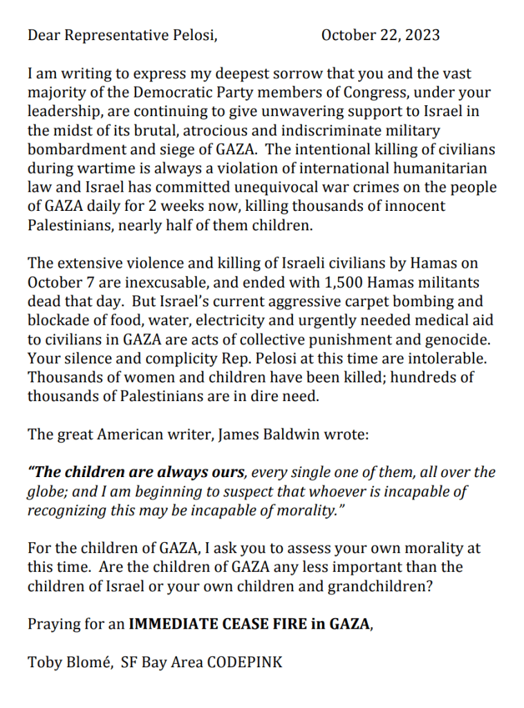 The CODEPINK Letter that Congresswoman Pelosi refused to accept from us: